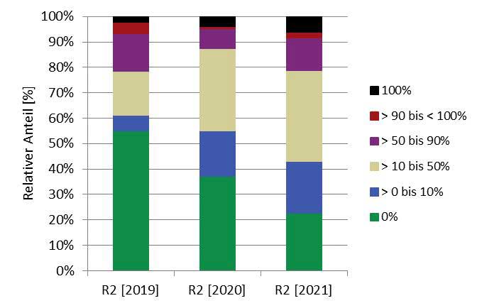 Abb.: Relativer Anteil an aktiven Nachkommen in den einzelnen Schadklassen der Triebsterbensintensität der Bonitur 2019, 2020 und 2021 für den Resistenztest R2 (Bonitur 2019: 15.912 von 23.433 Pflanzen aktiv; Bonitur 2020: 15.891 von 23.433 Pflanzen aktiv; Bonitur 2021: 15.889 von 23.433 aktiv).