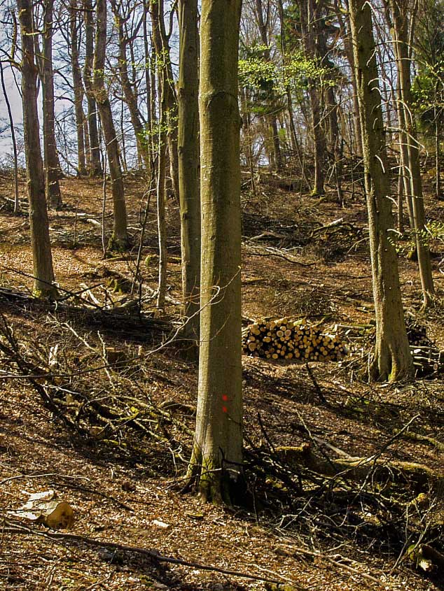 Abb. 2: Brennholz aus einer Durchforstung ist CO2-neutral, der geerntete Kohlenstoff ist bereits wieder im Bestand gebunden, bevor das Holz verbrannt ist, eine Kohlenstoffschuld existiert nicht. Der Kohlenstoffvorrat im Waldökosystem wird durch die Brennholznutzung nicht geschmälert, das Wachstum des Buchenbestandes wird durch Lichteinfall beschleunigt und auf weniger Bäume konzentriert, dadurch steigen die Chancen einer stofflichen Substitution mit deutlichen Klimavorteilen. Bild: R. Irslinger