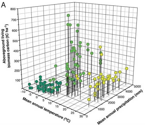 Abb. 1: Oberirdische lebende Biomasse von Primärwäldern in Abhängigkeit von mittlerer Jahrestemperatur und mittlerem Jahresniederschlag [23].