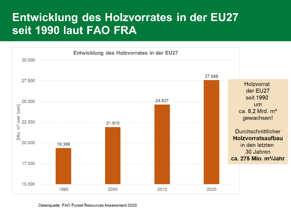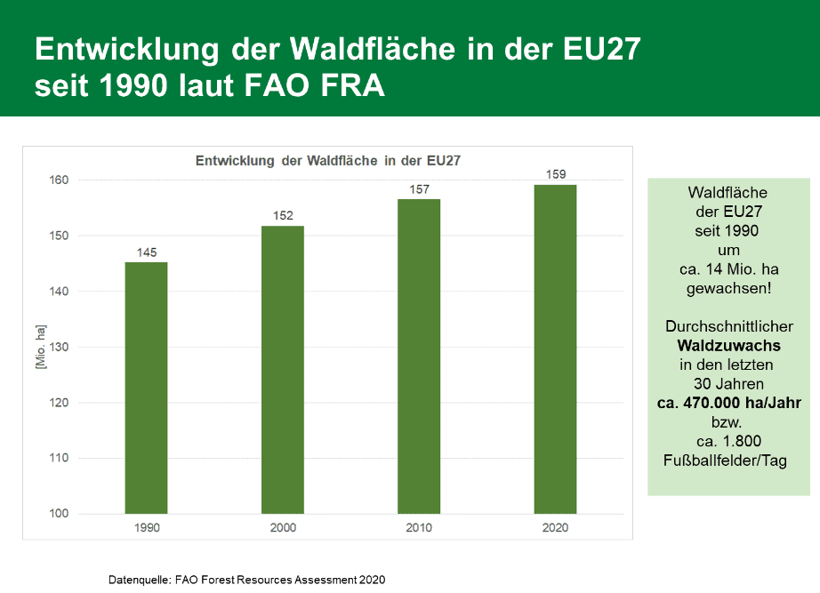 ABER: Der Klimawandel setzt dem Wald ziemlich zu, denn lange Dürreperioden, in Kombination mit Hitzeperioden schadet dem Wald. Daher ist die Bewirtschaftung enorm wichtig, um den Wald zu helfen, sich an den Klimawandel anzupassen. In der EU ergeht es dem Wald ähnlich. Auch hier nehmen die Waldflächen und der Vorrat kontinuierlich zu.