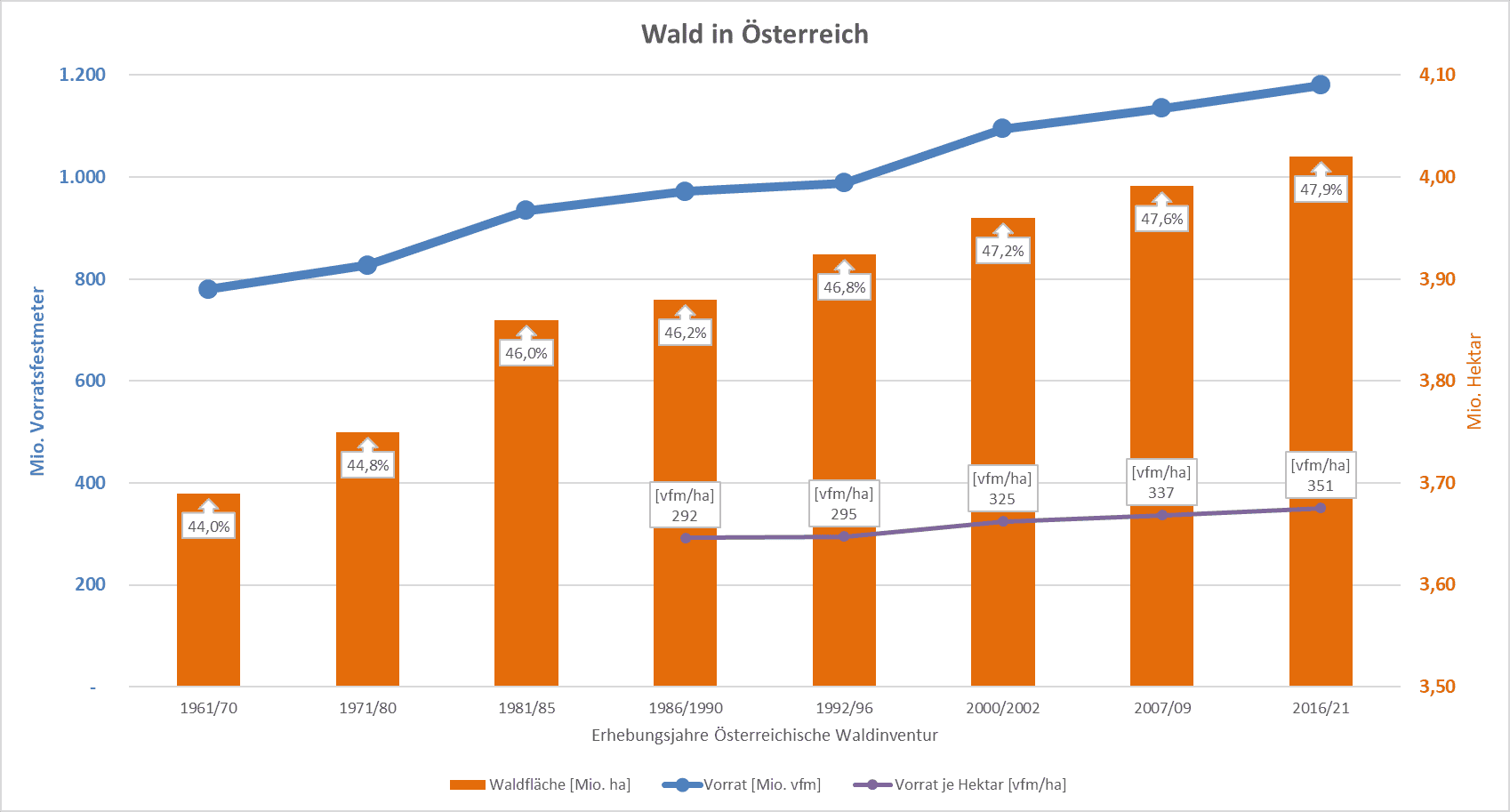 In Österreich und auch in Europa hat die Waldfläche und der Vorrat kontinuierlich zugenommen in den letzten Jahrzehnten.